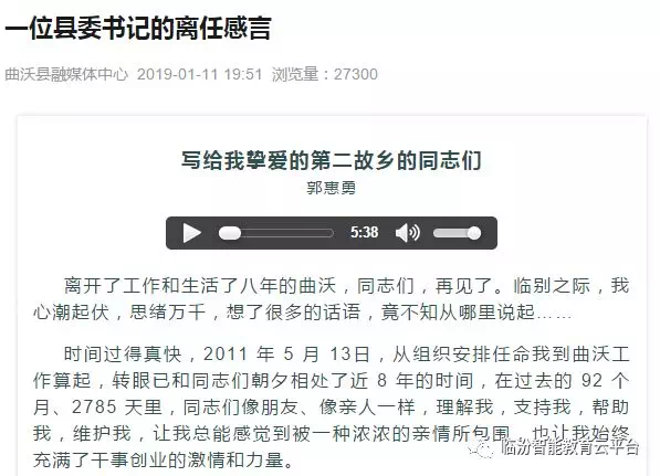 杨保春履任曲沃当天,曲沃县融媒体中心发布的《一位县委书记的离任感言》刷爆了本埠朋友圈。
